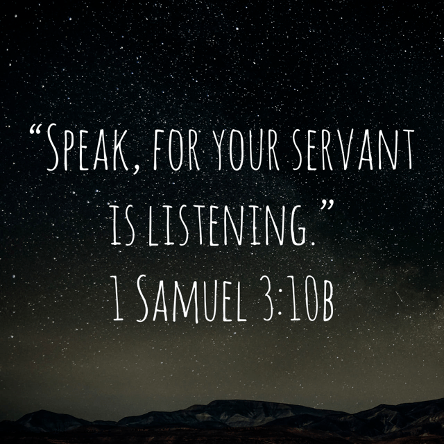 The verse from 1st Samuel above is from a story where Samuel was working with the Priest Eli. While sleeping, Samuel heard a voice which woke him up. He thought the voice was Eli so he went to see what Eli needed. But Eli had not called him. So, Samuel went back to bed. But again, two more times, Samuel heard the voice while he was sleeping and thought it was the voice of Eli.